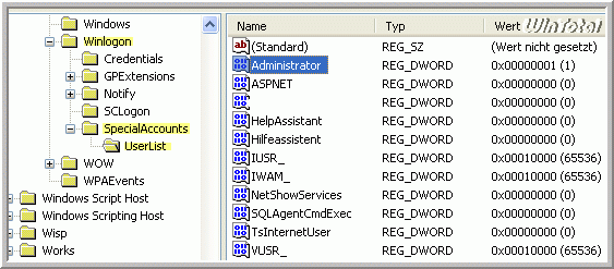 Auf diese Weise kann man auch andere Accounts verstecken, indem man einen neuen DWORD-Wert mit dem [Benutzernamen] anlegt und den Wert auf 0 setzt.