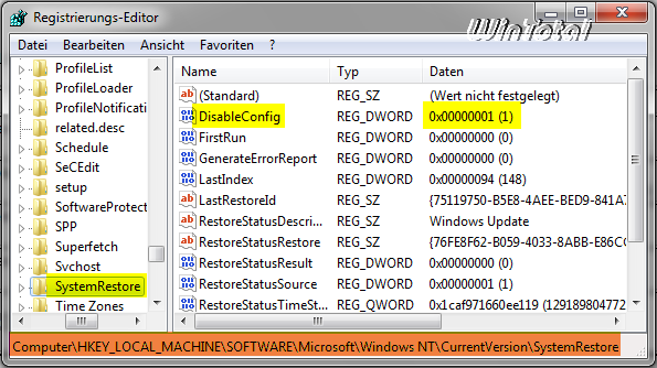 mit dem Eintrag DisableConfig und den Wert 1 deaktiviert die Systemwiederherstellung und entfernt die Registerkarte Systemwiederherstellung.