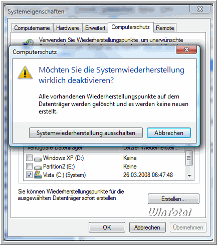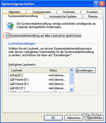 Anders als unter Windows ME kann man unter Windows XP, Windows Vista, Windows 7 und Windows 8 die Systemwiederherstellung ohne größere Eingriffe für einzelne Festplatten oder komplett abschalten. Hierzu begibt man sich in die „Systemsteuerung“ unter „System“ und dort auf die Registerkarte für die „Systemwiederherstellung“ – für Vista, Win7 und Win8 gilt hier der Link „Computerschutz“ – Register „Computerschutz„.
