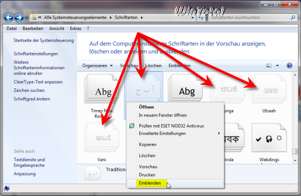 Sollten ein paar Schriftarten, wie auf diesen Beispielbild, als inaktiv sichtbar (blass) sein: Rechtsklick auf diese Schriftart und dann auf Einblenden klicken.