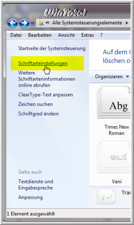 Systemsteuerung (Anzeige: Symbole) – Schriftarten – Schriftarteneinstellungen