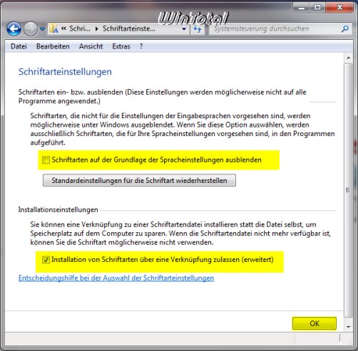 Installation von Schriftarten über eine Verknüpfung zulassen (erweitert) aktivieren (wenn Sie eine Schriftdatei in einem anderen Ordner mit der rechten Maustaste anklicken, „Als Verknüpfung installieren„)