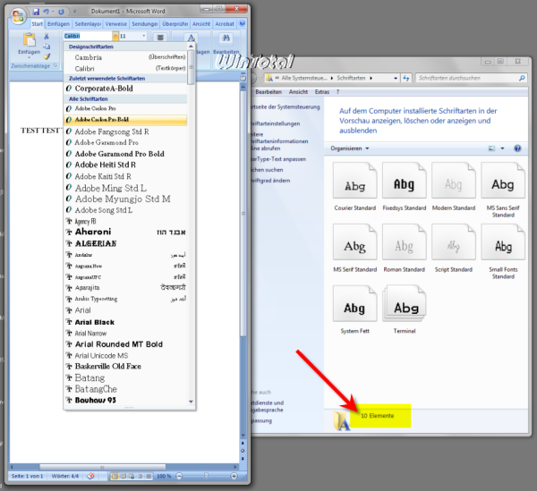 Schriftarten in Word – Windows-Schriftarten (im Beispiel nur 10 Schriften vorhanden)