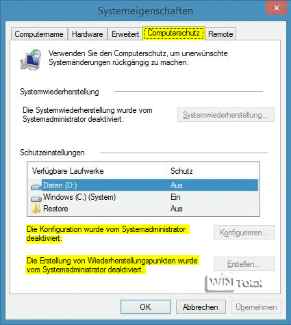 Die Konfiguration und die Einstellungen von Wiederherstellungspunkten wurde vom Systemadministrator deaktiviert