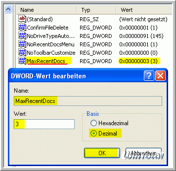 legt man einen neuen DWORD-Wert an mit dem Namen MaxRecentDocs und weist als Wert (Dezimal) die gewünschte Anzahl der Einträge zu. Danach den PC neu starten.