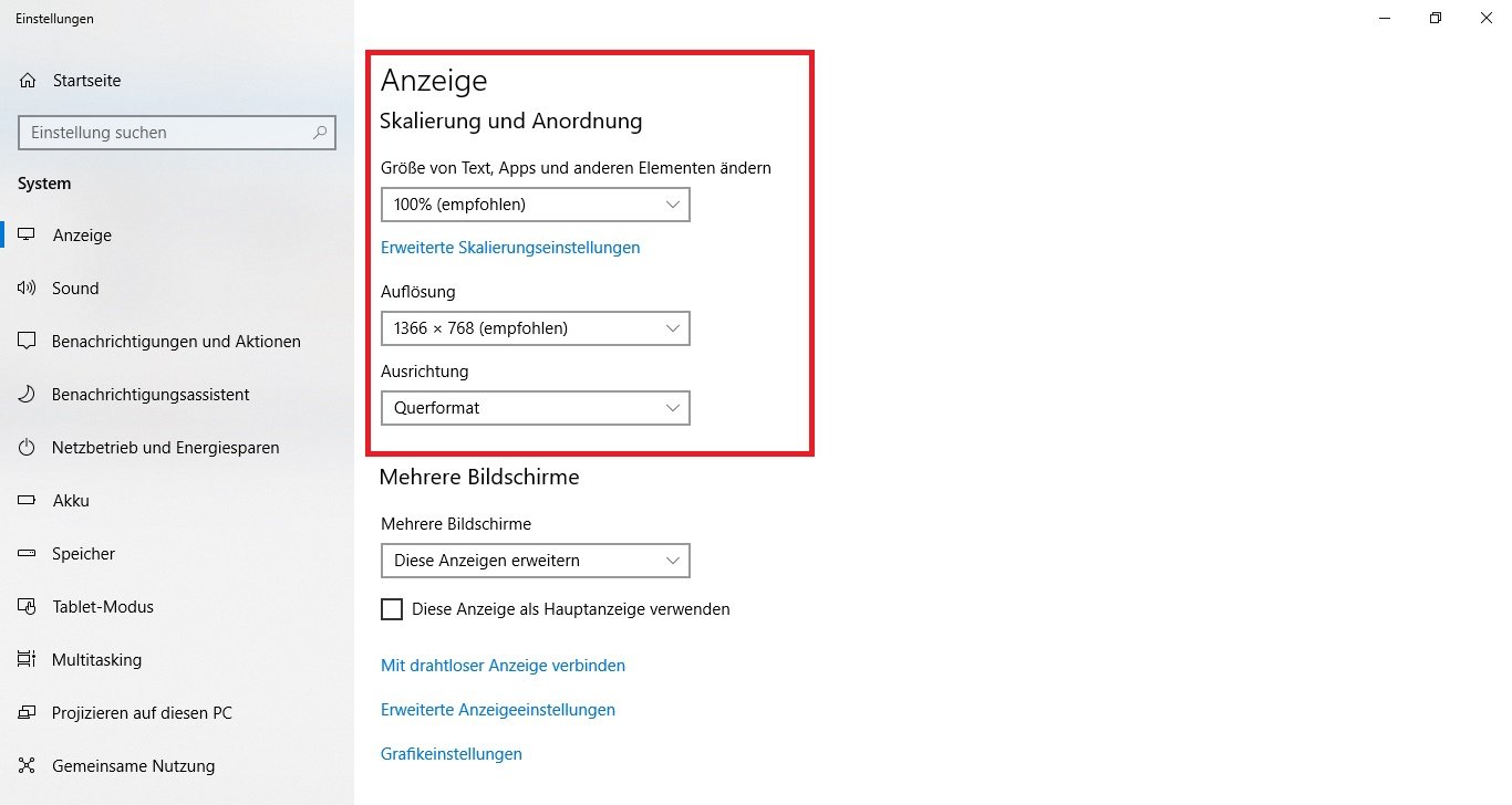 Hier haben Sie beispielsweise die Möglichkeit, über „Größe von Text, Apps und anderen Elementen ändern“ die Skalierung der Bildschirminhalte anzupassen, oder die Auflösung des zweiten Bildschirmes korrigieren, falls diese durch Windows 10 nicht richtig ermittelt worden ist.