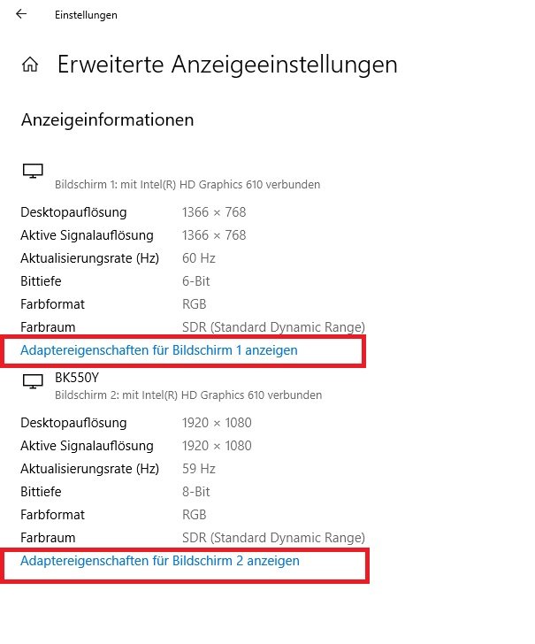 In den erweiterten Anzeigeeinstellungen finden Sie Optionen, die in den „normalen“ Anzeigeeinstellungen nicht enthalten sind. Klicken Sie auf die Links unter den Displayinformationen, um zu den Adaptereigenschaften zu gelangen.