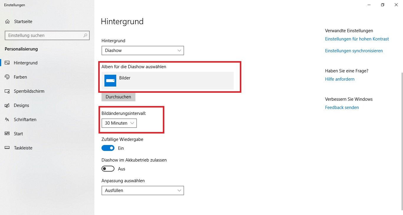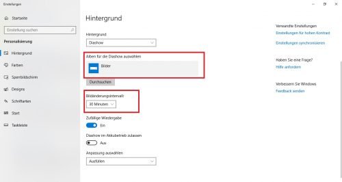Wählen Sie die gewünschten Bilder für Ihre Diashow aus und legen Sie fest, in welchen Intervallen der Hintergrund ausgetauscht werden soll. - Wir entscheiden für uns für eine Diashow. Klicken Sie dafür auf „Durchsuchen“ und navigieren Sie zu dem Ordner, dessen Bilder Sie für den Hintergrund nutzen möchten.