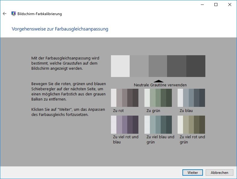 Windows 10 besitzt ein integriertes Tool (dccw, „Display Color Calibration Tool“) mit dem Sie die Farbkalibrierung für Ihre Monitore vornehmen können.