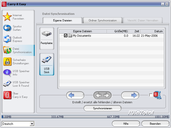 Carry it Easy richtet sich vorwiegend an USB-Stick-Nutzer. Die Software ermöglicht den Datenabgleich zwischen Host-System und USB-Stick und kann die Daten optional komprimieren und verschlüsseln.