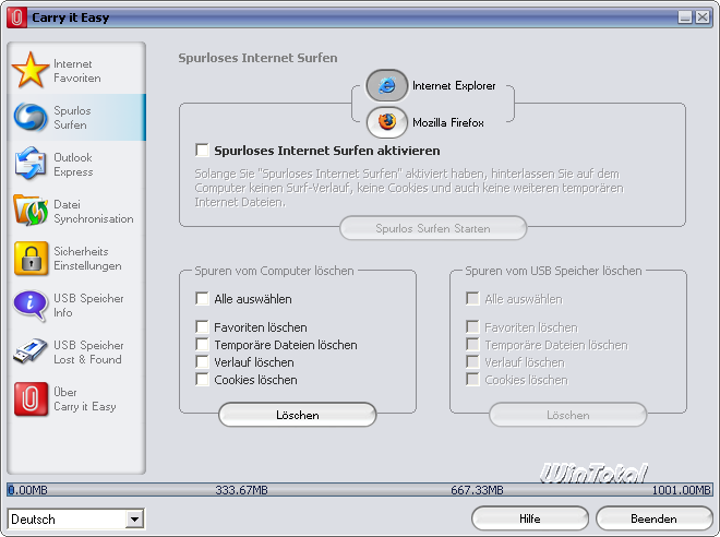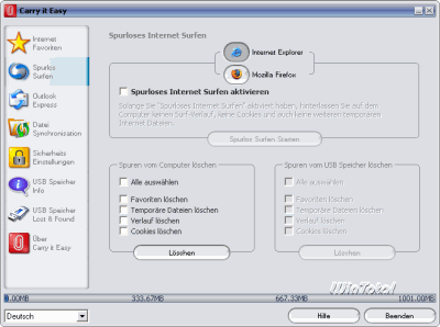 Für den Internet Explorer und Firefox bietet das Programm die Möglichkeit, die Favoriten bzw. Bookmarks mit dem Host-Rechner zu synchronisieren und spurlos auf dem Rechner zu surfen. Hierzu löscht das Programm nach dem Surfen alle Spuren (Verlauf, Cookies, WebCache) oder nutzt die Einstellungen vom Stick und überschreibt damit die Einstellungen des Host-Rechners. Nach dem Beenden schreibt Carry it Easy die Ursprungsdaten wieder zurück.