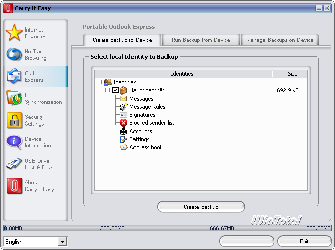 Als weiteres Feature kann Carry it Easy ein Outlook Express-Konto mit allen Einstellungen, Mails und Adressbuch auf den Stick sichern und diese Daten auf einem anderen System wieder einspielen. Beim Beenden von Carry it Easy werden die Daten dann auf dem Rechner wieder gelöscht. Sie können damit Outlook Express mobil auf jedem Rechner mit diesem Mailclient nutzen.