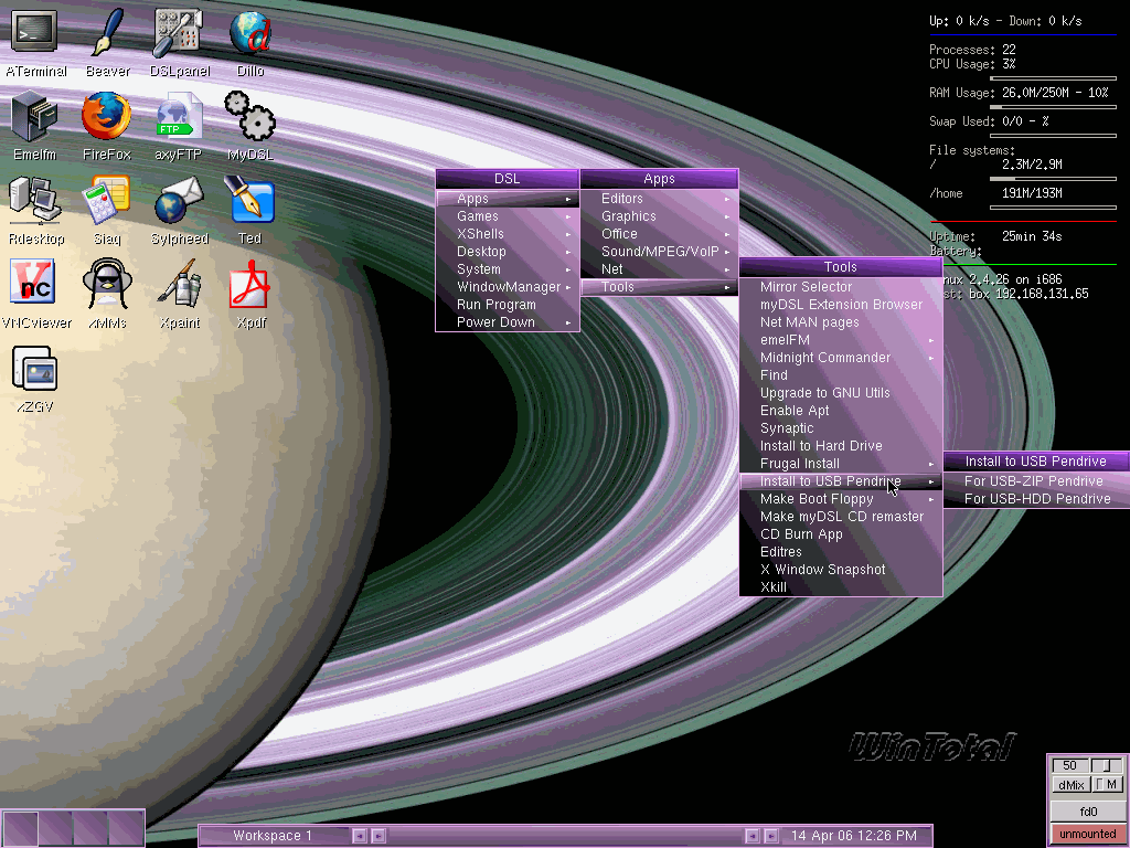 Damm Small Linux, basierend auf dem Knoppix-Linux, eignet sich auf Grund der geringen Größe (knapp 50 MByte) des Linux-Derivats ideal als Notfallsystem für USB-Sticks. DSL bringt eine (fast) vollständige Desktopumgebung und zahlreiche Programme für die Kommandozeile mit. Bei der Auswahl der enthaltenen Anwendungen wird auf das wichtige Maß von Nutzwert, Geschwindigkeit und Speicherverbrauch geachtet. Das Betriebssystem lässt sich direkt aus DSL (Tools -> Install to USB Pendrive) auf einem USB-Stick einrichten und von dort booten.
