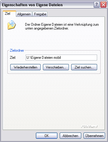 - Auf dem 2. Rechner (z.B. Laptop) wechseln Sie ebenfalls in die Eigenschaften von Eigene Dateien, wählen hier aber Ziel suchen, um den Pfad zu ändern und verweisen auf den Ordner Eigene Dateien Mobil. Jetzt ändert Windows nur die Pfadangabe, verschiebt aber nicht die Inhalte.