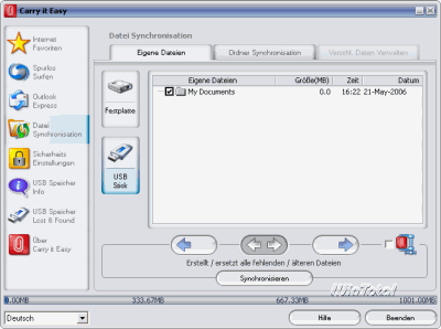 Die beschriebene Variante hat aber den Nachteil, dass man den Stick dann immer angesteckt haben muss und auch Dateien auf den Stick kommen, die man unter Umständen nicht unbedingt immer benötigt, die aber Platz auf dem Stick verbrauchen. Eine bessere Variante ist daher die Synchronisation benötigter Ordner und Dateien mit dem „Hauptrechner“. Viele Hersteller legen ihren Sticks kleine Programme bei, welche Dateien zwischen dem Stick und dem PC abgleichen können.