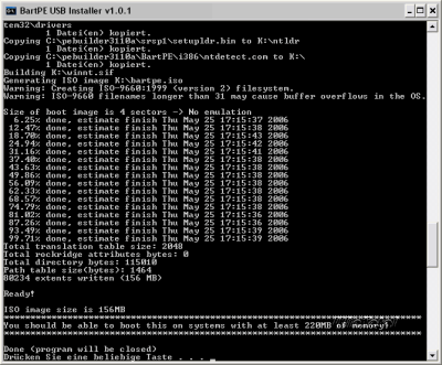 - Die Variante über die RAM-Disk benötigt eine Menge Arbeitsspeicher. Die ISO-Datei wird erst in eine RAM-Disk geladen. Dieser Speicher steht für den Betrieb von Barts PE später nicht mehr zur Verfügung. Je nach Größe der PE-Installation kann es selbst bei 512 MB sehr schnell eng werden.