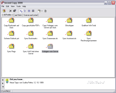 Speziell für USB-Stick-Benutzer bieten sich auch die Programme MobileAssistant oder Carry it Easy zum Datenabgleich an. Als sehr gute Alternative zum Synchronisieren beliebiger Dateien und Ordner hat sich zudem die Shareware Second Copy bewährt.