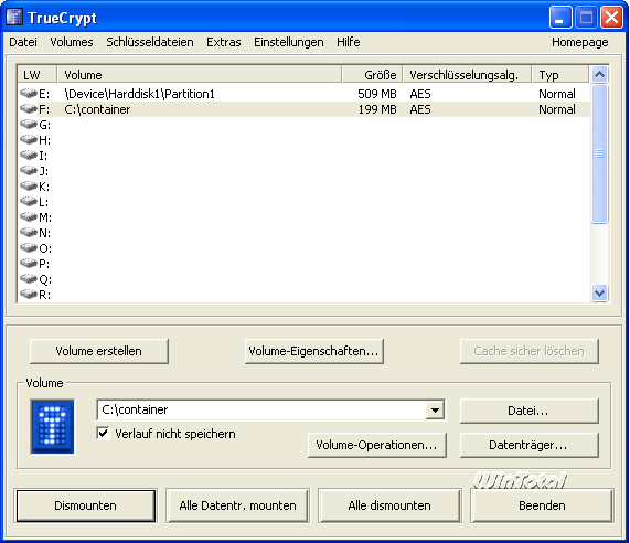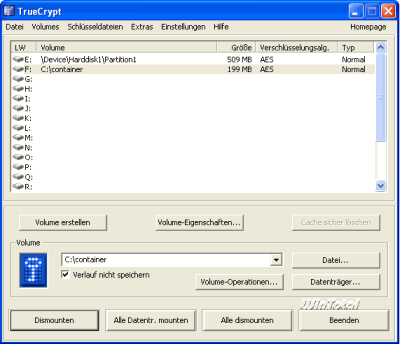 Ein Volume kann dabei eine Containerdatei oder eine echtes Laufwerk (USB-Stick, Festplattenpartition) sein. Ohne Entschlüsselung sind weder Dateistruktur noch Inhalte der Volumes einsehbar.
