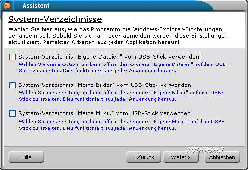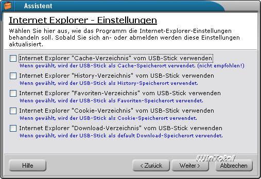 Man ist somit in der Lage, seinen „eigenen“ Arbeitsplatz auf andere Rechner zu übertragen. Einzig und allein die Speicherkapazität des USB-Sticks ist eine Einschränkung. Am besten eignet sich die Software daher für sensible Daten wie Verlauf des IE, Cookies, Favoriten etc.