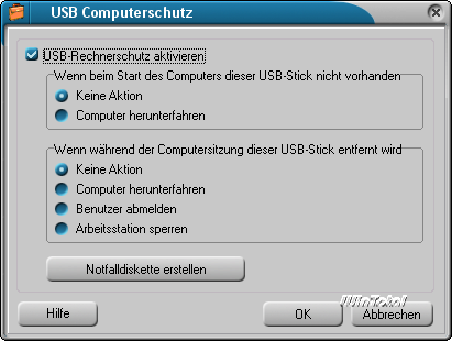 Ein weiteres Feature ist der USB-Computerschutz. Hiermit legen Sie fest, ob der gerade aktive Stick als „Schlüssel“ zum Starten des Rechners benötigt wird. Zudem kann man einstellen, wie sich das System verhält, wenn der Stick abgezogen wird (herunterfahren, sperren etc.). Eine Notfalldiskette dient als 2. Schlüssel, wenn der Stick mal abhanden kommt oder defekt ist.