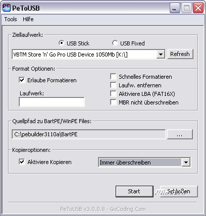 Im Gegensatz zur ersten Variante benötigt die Lösung PEToUSB keine RAM-Disk und damit auch weniger RAM auf dem System. Die Handhabung ist ebenfalls sehr simpel. Zunächst erstellen Sie ein Barts PE-System, auch ohne ISO-Datei. Anschließend starten Sie PEToUSB, geben den Quellpfad des BartPE-Systems an und das Ziellaufwerk.