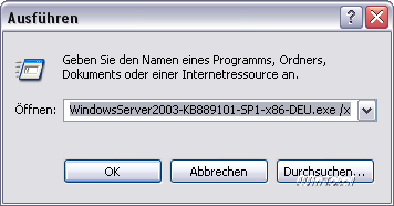 Entpacken Sie diese Datei mit dem Aufruf „WindowsServer2003-KB889101-SP1-x86-DEU.exe /x“ in einen beliebigen Ordner, z.B.: c:server2003sp1.