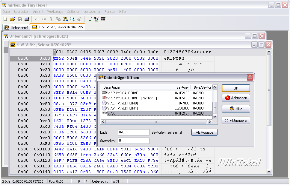 Sollte es beim Formatieren zu einer Fehlermeldung kommen, sollten Sie den ersten Sektor des Sticks mit einem Hexeditor überschreiben. Bei Tiny Hexer wählen Sie hierzu unter Datei -> Datenträger öffnen den USB-Stick aus.