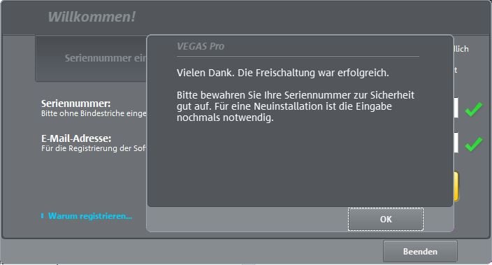 Beim anschließenden Start der Software über das Desktop-Icon werden wir zur Eingabe eines Lizenzschlüssels aufgefordert. Wir geben hier unseren Test-Productkey und unsere Email-Adresse ein und nach einer kurzen Ersteinrichtung ist VEGAS Pro 17 auch schon einsatzbereit.