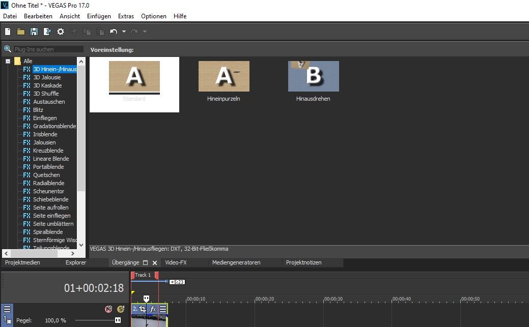 Dafür nehmen allerdings die Detailanpassungen deutlich mehr Zeit in Anspruch. Automatische Voreinstellungen oder Templates gibt es in VEGAS Pro 17 leider so gut wie gar keine. Die Anzeige der Plug-Ins und Effekte erfolgt ausschließlich über minimalistische Listen, wodurch speziell Anfänger etwas Einarbeitungszeit benötigen.