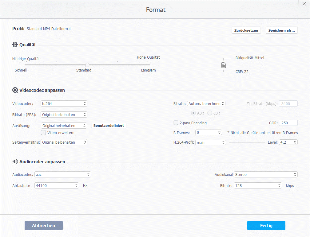 Wer sich etwas besser auskennt, kann die Ausgabeprofile auch noch den eigenen Wünschen anpassen und die Qualität, verwendeter Codec, Bildrate, Auflösung, Bitrate, Audiocodec und vieles selbst definieren.