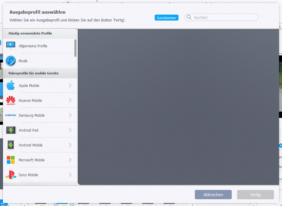 Vor der Ausgabe des fertigen Videos oder zur Formatkonvertierung müssen Sie das Zielformat bestimmen. Sie können dabei eines der häufigen Dateiformate auswählen oder mit einem Klick auf den Button Zielformat eines der vordefinierten Ausgabeprofile auswählen.