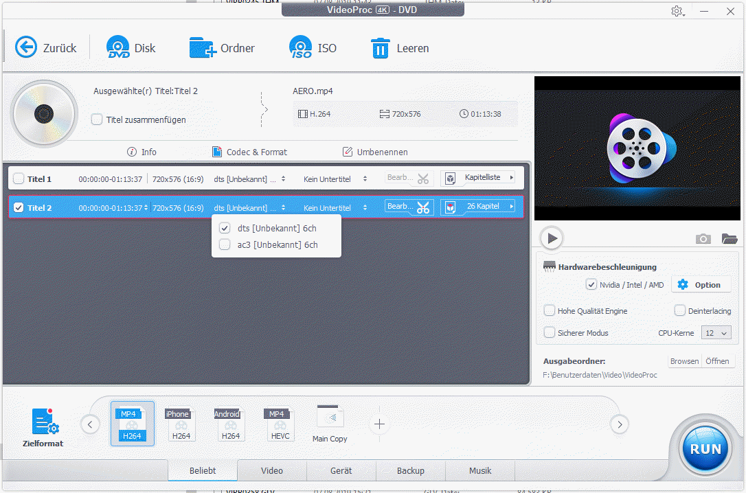 Mit der Funktion DVD können Sie von einer optischen Disc, ISO-Datei oder VIDEO_TS-Ordner den Inhalt einer DVD in eines der vielen Ausgabeformate rippen. Sie können dabei die Kapitel gezielt auswählen und auch die Untertitel oder Tonspuren festlegen, welche konvertiert werden sollen.