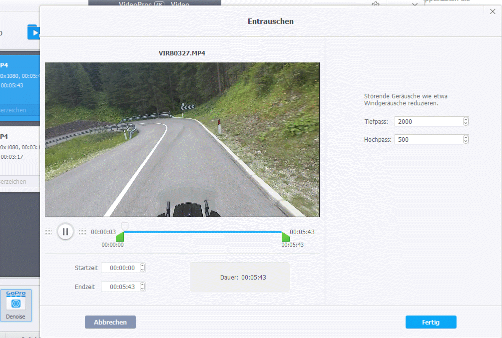 Ein weiteres Problem vieler Action-Cam- und Drohnen-Videos sind störende Windgeräusche. Statt die Tonspur komplett zu entfernen, bietet sich die Funktion „Denoise“ an. Die Windgeräusche können hier über Werte für den Tiefpass und Hochpass recht gut rausgefiltert werden.