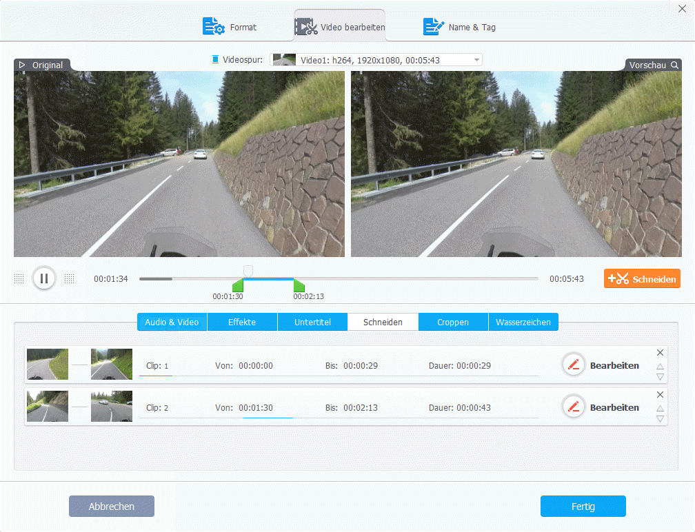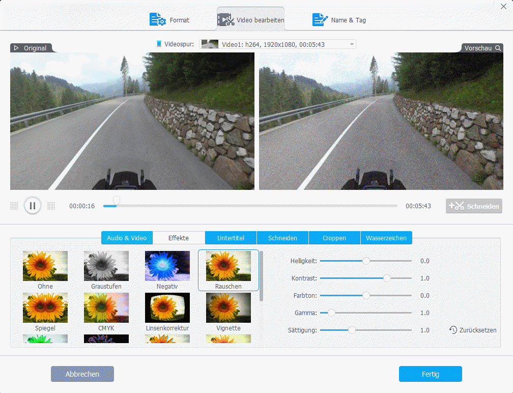 - Videobearbeitung mit Schneiden, Zusammenfügen, Drehen, Skalieren, verschiedene Effekte, Untertitel, Video stabilisieren, Fisheye-Effekt entfernen, Geräusche entfernen oder Video verbessern,