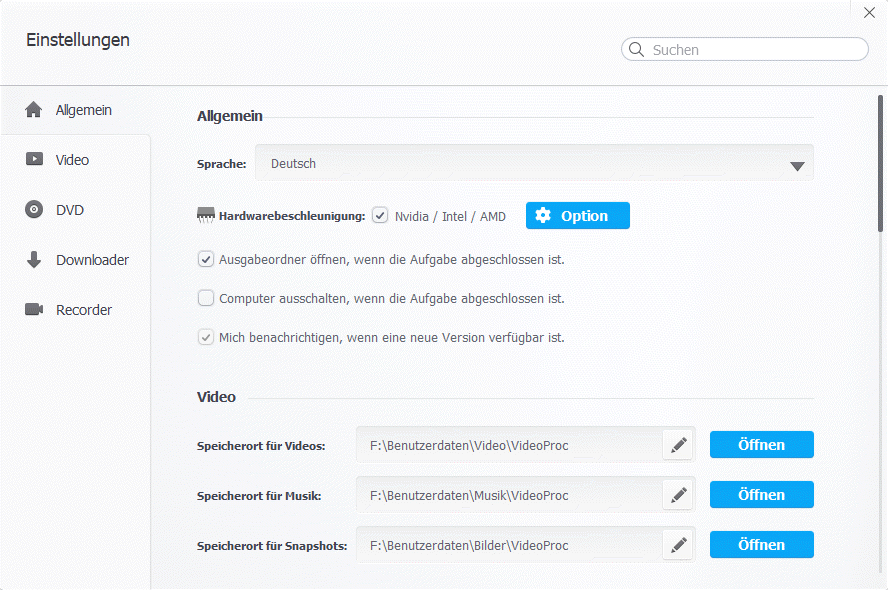 In den Einstellungen können Sie die Speicherorte für Videos, Musik und Snapshots festlegen und Vorgaben für den DVD-Ripper, Downloader und Screen-Recorder anpassen.