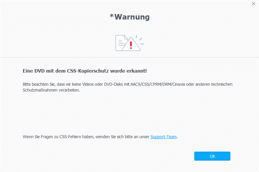 Aufgrund von § 95a UrhG ist es in Deutschland nicht erlaubt, technische Schutzmaßnahmen wie die CSS-Verschlüsselung von DVDs zu umgehen, wenngleich dies technisch möglich wäre. VideoProc 4K sperrt daher die Funktion zum Auslesen mit einem Hinweis.
