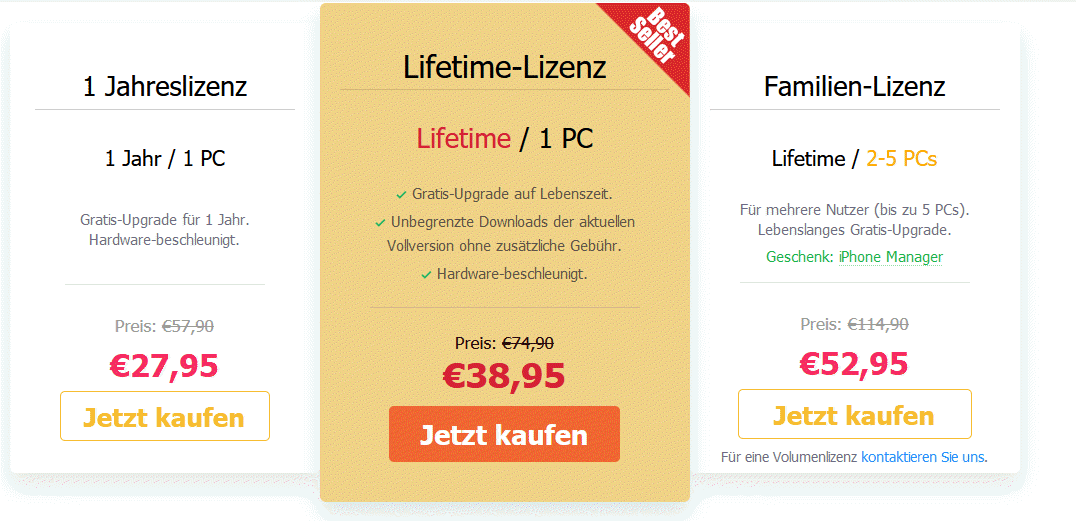 Der Hersteller verlangt für die Vollversion mit Rabatten zum Zeitpunkt des Tests 27,95 Euro für eine Jahreslizenz. Nach Ablauf eines Jahres wird die Hardware-Beschleunigung deaktiviert. Eine Lifetime-Lizenz kostet dagegen 38,95 Euro. Wer mehrere PCs besitzt, kann auch eine Familienlizenz für bis zu fünf PCs/Mac erwerben.
