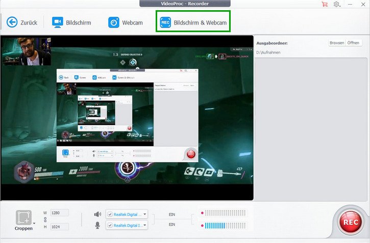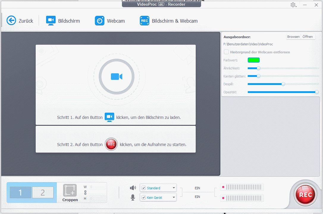 Mit der Recorder-Funktion kann VideoProc 4K Videos vom Bildschirm und/oder der Webcam aufnehmen. Hierbei kann zum Standard-Ton (beispielsweise vom PC), auch noch ein Mikrofon beigemischt werden.