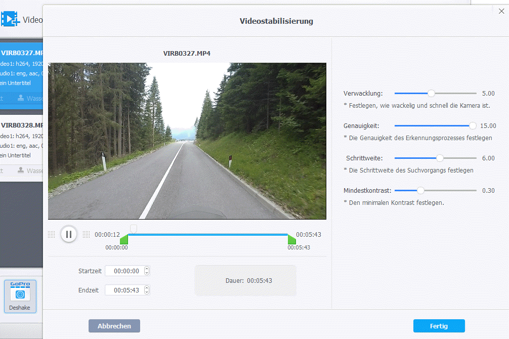 Videos von Smartphones und Action-Cams können bei Bewegung sehr schnell verwackeln und damit beim Zuschauer sogar Übelkeit hervorrufen. Um diesem Problem entgegenzuwirken, bietet viele Action-Cams einen integrierten Bildstabilisator. Wenn dieser bei der Aufnahme nicht aktiviert war oder keine gute Arbeit leistete, kann VideoProc 4K mit der Funktion „Deshake“ in der „Toolbox“ die Aufnahme nachträglich stabilisieren.