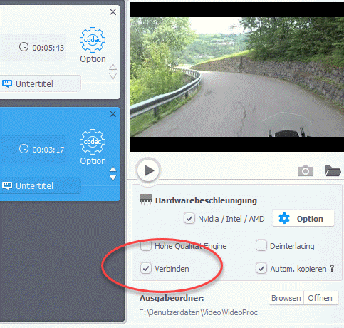 Wenn Sie mehrere Videos zu einem Video zusammenfügen möchte, ist dies über die Funktion „Verbinden“ möglich. Damit werden alle Videos im Programmfenster bei der Ausgabe zu einem Video zusammengefügt.