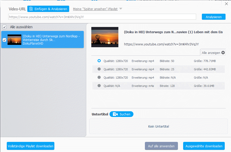 Nach einer Analyse zeigt VideoProc 4K alle möglichen Qualitätsstufen an, in welchen das Video heruntergeladen werden kann. Sie können auf Wunsch auch nur die Audiospur herunterladen, beispielsweise von Musik-Videos.