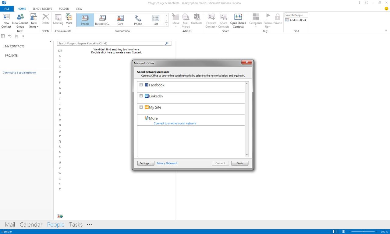 Integration mit der sozialen Gemeinschaft und Vernetzung mit allerlei Nützlichem ist ein weiterer ausgemachter Fokus in Office 2013. Es sind vor allem die vielen kleinen und versteckten Features, die an dieser Stelle begeistern und egal, ob die Bing-Suche im Kontextmenü von Word, Outlooks neue Fähigkeit – im Falle eines vorhandener Skype-Accounts und einer Skype-Installation – sich direkt mit Kontakten zu connecten (noch nicht in der Preview enthalten), die zahlreichen Möglichkeiten rund um das jüngst zugekaufte Yammer oder People Card, um universelle Kontaktdaten in den diversen sozialen Netzwerken zu sammeln: Die neue Office-Vielfalt verspricht einiges.