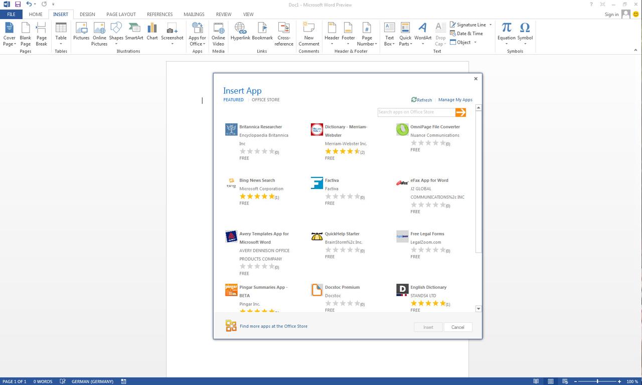 Hinter Begriffen wie Task Pane- oder Content Apps verstecken sich an dieser Stelle nachladbare Funktionalitäten, über die dann z.B. Kartenmaterial aus Bing Maps direkt angewendet und verwertbar wird oder auch Formulare für Hotel-Buchungen zukünftig direkt ausführbar werden. Für Word und Excel der Preview enthält das „Einfügen“-Menü in seinem Ribbon bereits das vollkommen neue „Apps for Office“-Element, über das Sie sich wie inzwischen fast überall üblich zusätzliche Apps herunterladen können und Zugriff auf den Office Store – den Marketplace für Office-Apps – nehmen können. Auch für Outlook und SharePoint hält der eigene Online-Store entsprechende Apps bereit, darunter durchaus viele freie Apps sowie diverse kostenpflichtige Angebote für das professionelle Office-Arbeitsumfeld.