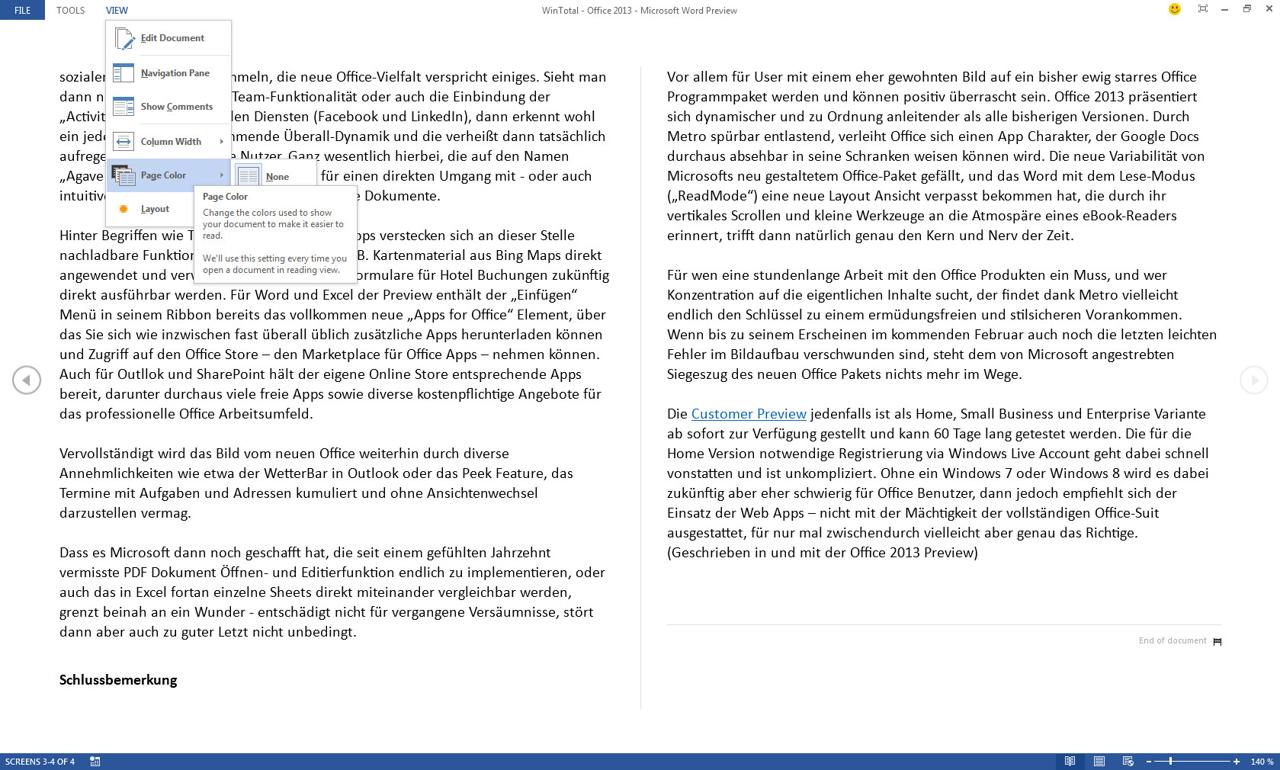 Vor allem User mit einem eher gewohnten Bild auf ein bisher ewig starres Office-Programmpaket werden und können positiv überrascht sein. Office 2013 präsentiert sich dynamischer und zu Ordnung anleitender als alle bisherigen Versionen. Durch Metro spürbar entlastend, verleiht Office sich einen App-Charakter, der Google Docs durchaus absehbar in seine Schranken weisen können wird. Die neue Variabilität von Microsofts Office-Paket gefällt, und dass Word mit dem Lese-Modus („ReadMode“) eine neue Layout-Ansicht verpasst bekommen hat, die durch ihr vertikales Scrollen und kleine Werkzeuge an die Atmospäre eines eBook-Readers erinnert, trifft dann natürlich genau den Kern und Nerv der Zeit.