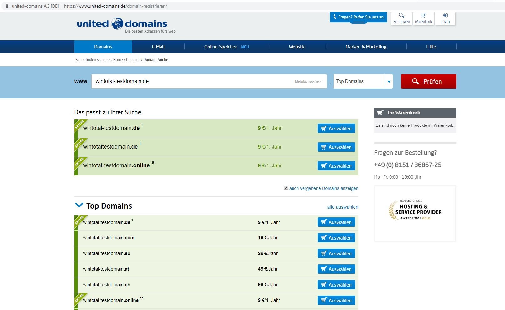 - Überprüfen Sie als erste auf der Anbieter-Webseite, ob Ihre Wunschdomain noch frei ist und legen Sie sie anschließend in den Warenkorb. Sie haben natürlich jederzeit die Möglichkeit, gleich mehrere Domains auf einmal zu sichern.