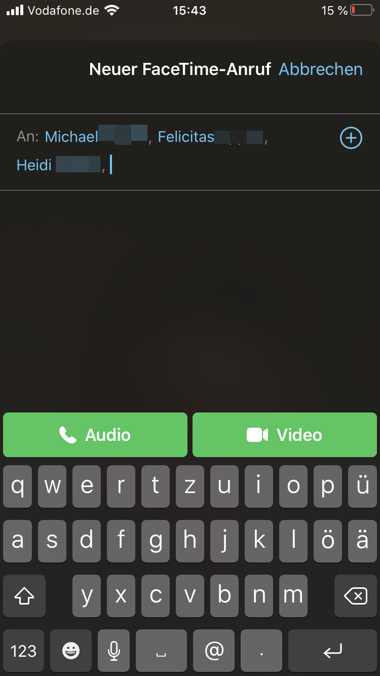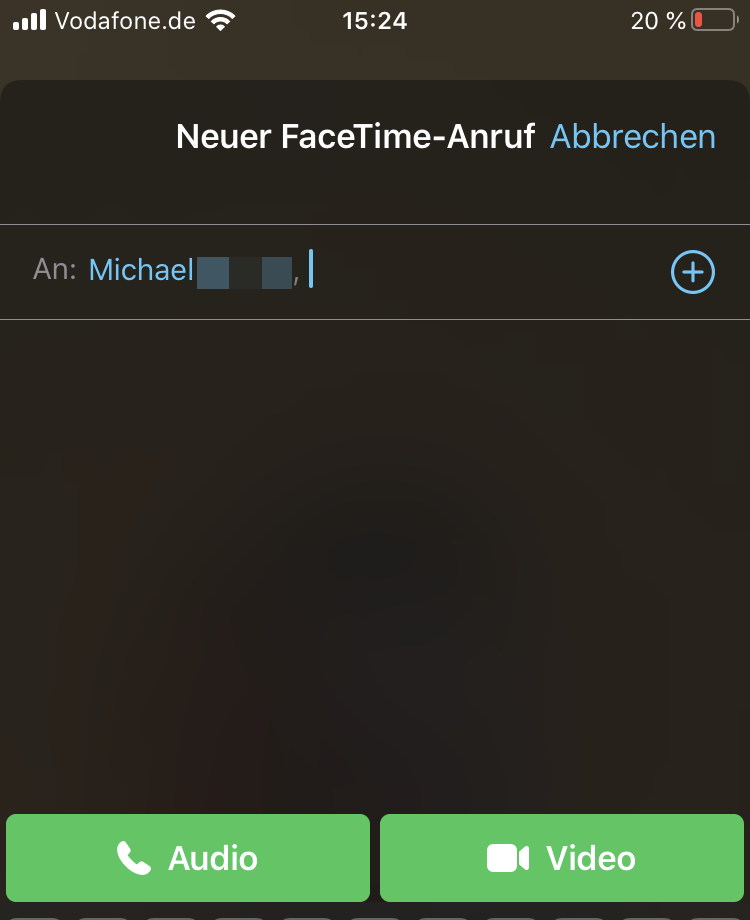 Um einen Teilnehmer über FaceTime anzurufen, starten Sie die FaceTime-App auf Ihrem Gerät. Wählen Sie über das „Plus“-Symbol den Kontakt auf, mit dem Sie eine Verbindung herstellen möchten. Hat der Teilnehmer nur ein Gerät ohne Rufnummer, beispielsweise ein iPad, sind Kontaktaufnahmen auch über dessen Mailanschrift möglich, sofern wie unter Punkt 4. beschrieben, dies auch aktiviert wurde.