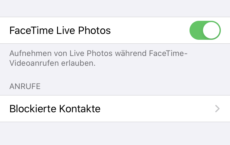In den FaceTime-Einstellungen finden Sie noch ganz unten die Funktion FaceTime Live Photos. Wenn Sie diese aktivieren, können Sie während des Video-Chats auch Live Photos von Ihrem Anrufer aufnehmen, sofern beide Teilnehmer diese Funktion aktiviert haben.