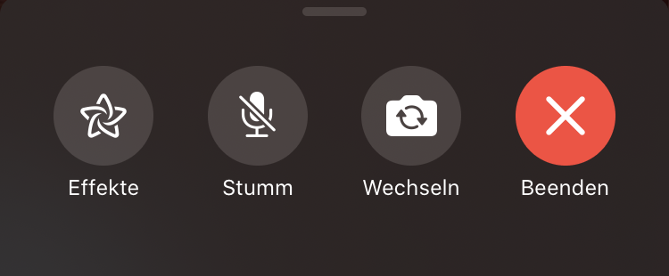 Der Buttons „Effekte“ steht nur auf neueren Geräten zur Verfügung und bietet beispielsweise die Möglichkeit, Sticker und Texte zu senden oder das Videobild direkt mit verschiedenen Filtern zu verändern. Sie können über die Effekte auch mit einem erstellten Memoji statt Ihrem echten Videobild telefonieren.