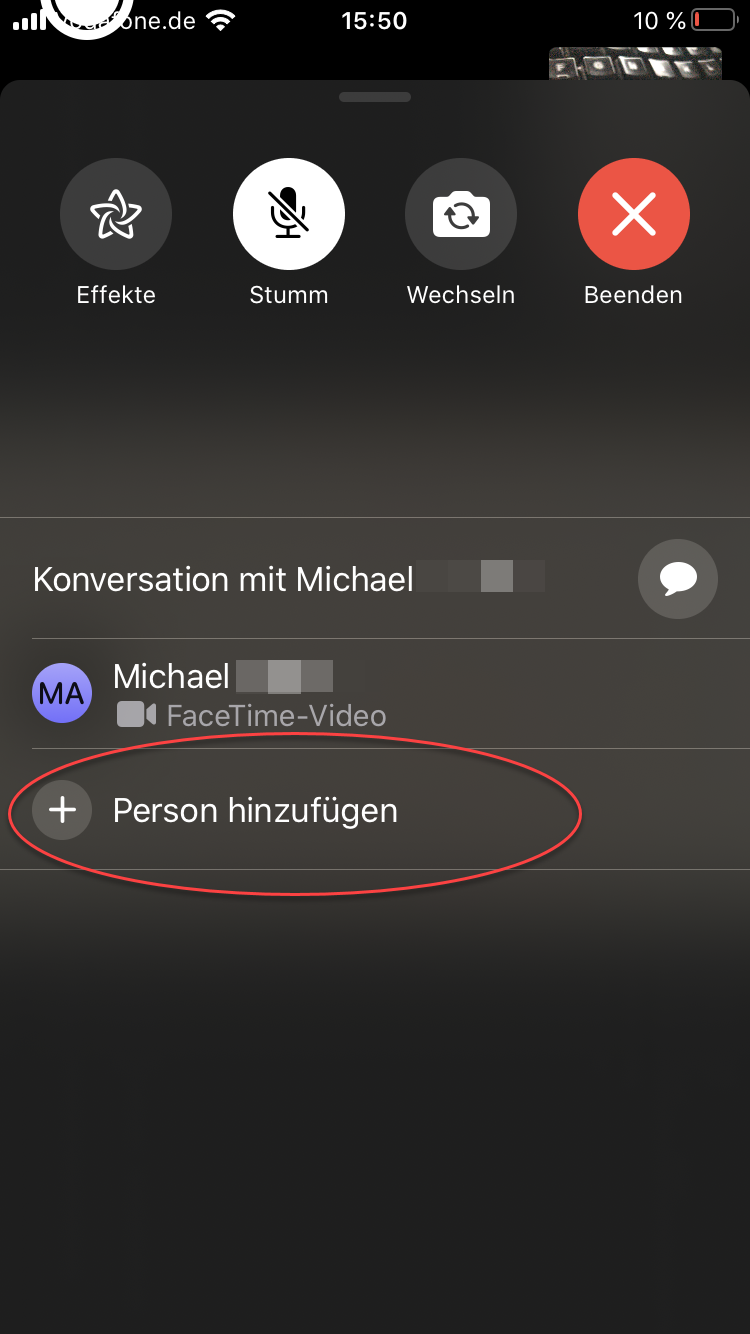Etwas versteckt hat Apple auch eine Funktion eingebaut, zu einer bestehenden Sitzung noch weitere Teilnehmer hinzufügen. Drücken Sie dazu länger auf den Bereich mit den vier Buttons während einer FaceTime-Sitzung. Es erscheint dann ein eine Auswahl, weitere Person in den Chat mit aufzunehmen.