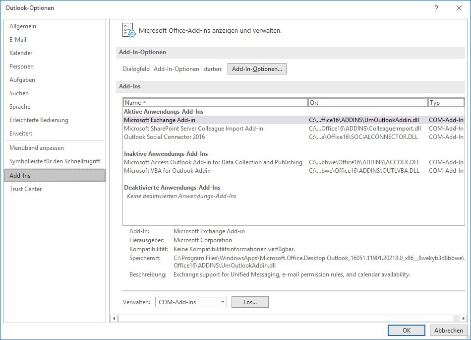 Tipp: Welche Erweiterungen bereits in Ihrem Client installiert sind, können Sie unter „Datei -> Optionen -> Add-Ins“ einsehen.